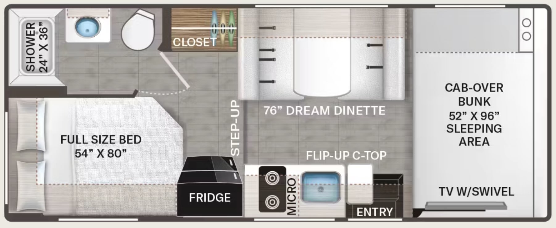 Wir vermieten ausschließlich hochwertige Wohnmobile bis maximal 30 Fuss Länge. Diese Grundrisse sind noch handlich genug für die engsten Campgrounds und Städte, bieten aber trotzdem auch für große Familien ausreichend Platz. Seit 2023 im Programm haben wir auch das SUV-Gespann mit Jeep und Wohnwagen. Hierbei handelt es sich um wendige Abenteurer die mit wenigen Metern Länge durch die durchdachte Raumgestaltung viel Platz bieten und sehr handlich beim Fahren sind.